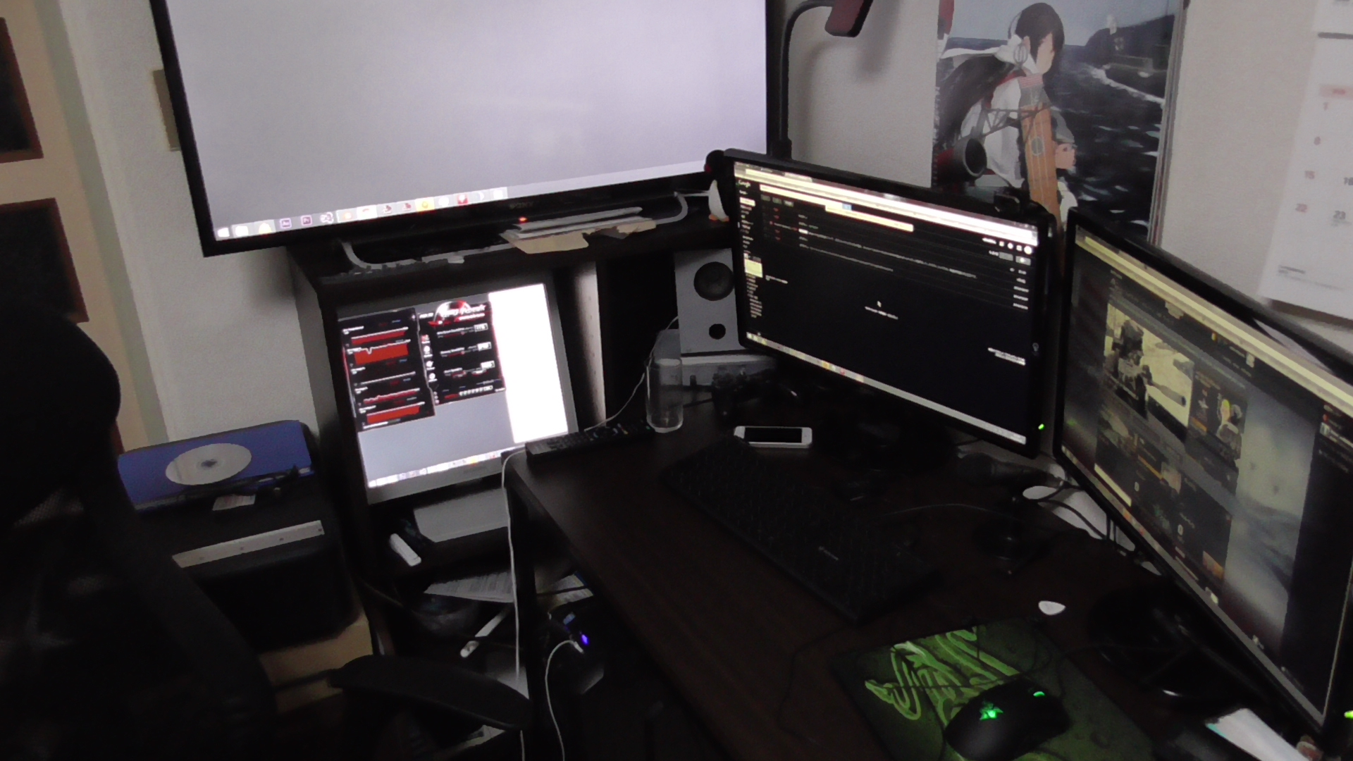 私の作業環境です。前二つがメインモニタ、左の下が艦これ専用モニタ(実家にあった)、左の上が動画を見るためのテレビ(SONY BRAVIA40型)です。キーボードは安いけどゲーミングキーボードとして有名っぽいSAVIORのなんとかいうキーボード、マウスはDeathAdder 2013、マウスパッドもRazerのマウスパッドですね。信者なんかじゃないですよ?